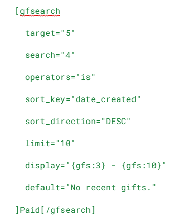 How it works: Filter entries where Status = Paid. Sort by date_created DESC. Limit to 10. Render Name – Amount. Add a default so the block never looks broken.